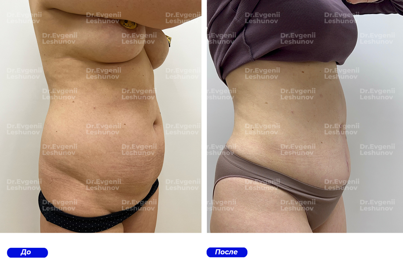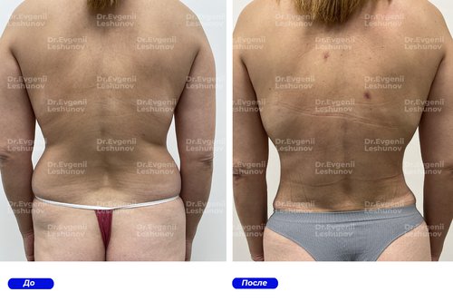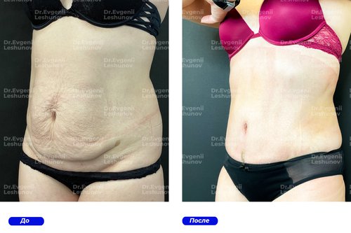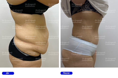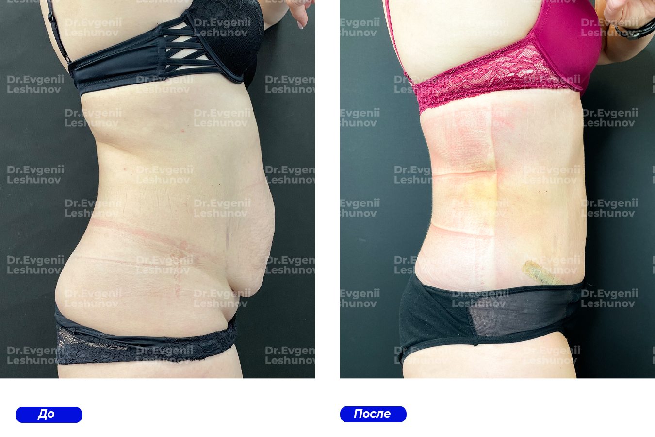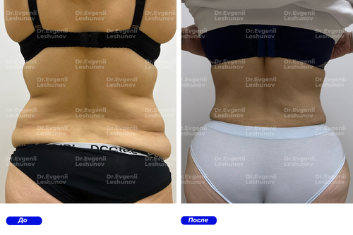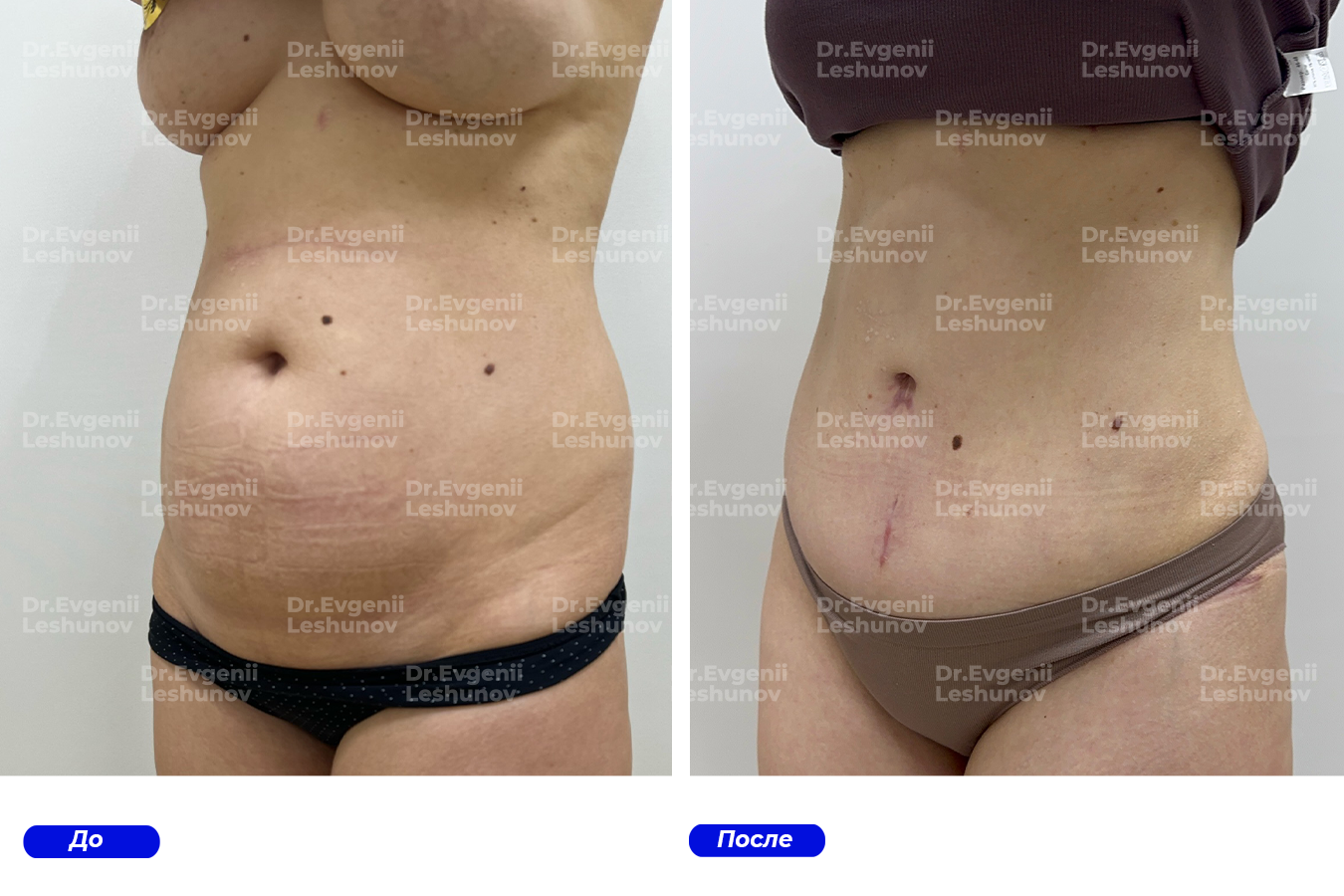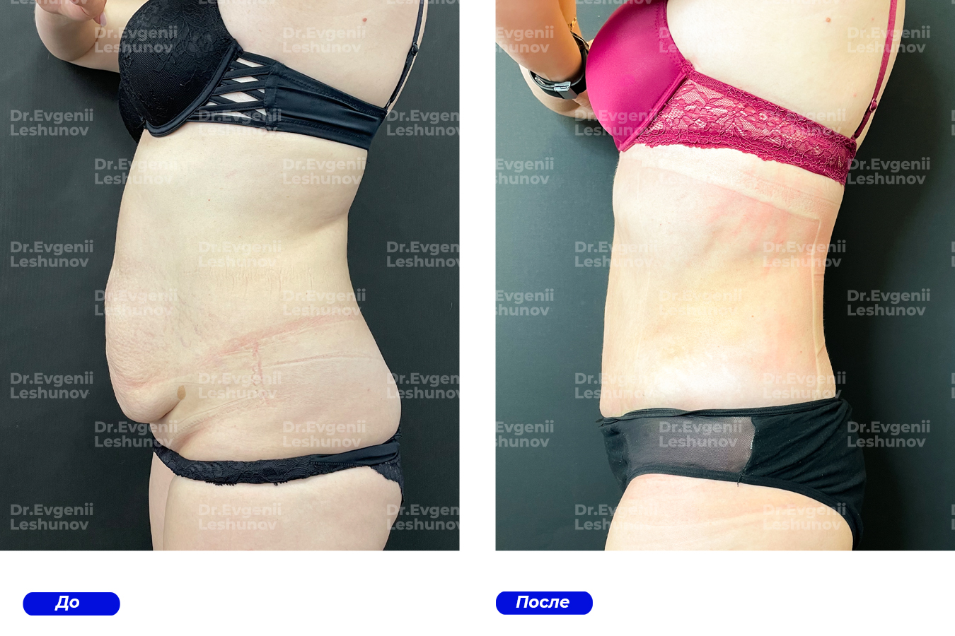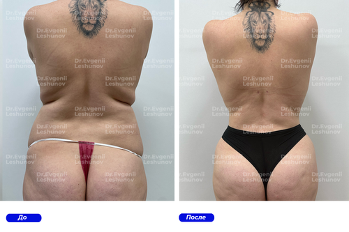 Пациентка, 46 лет, обратилась с жалобами на избыток жировой клетчатки в области живота, фланков и поясницы, нависающий кожно-жировой лоскут над имеющимся после кесаревого сечения рубцом, диастаз прямых мышц живота и пупочную грыжу. Была выполнена липосакция передней брюшной стенки, фланков и поясницы, выполнено иссечение кожно-жирового лоскута в пределах имеющегося рубца, перемещение пупка, устранение диастаза прямых мышц живота и пупочной грыжи. Результат через 1 месяц после операции.