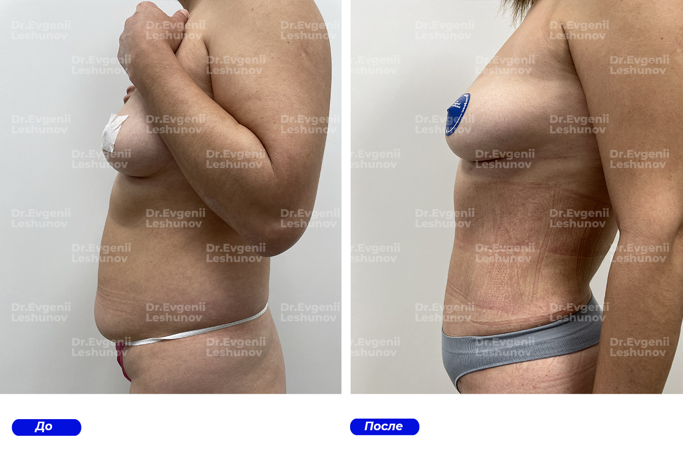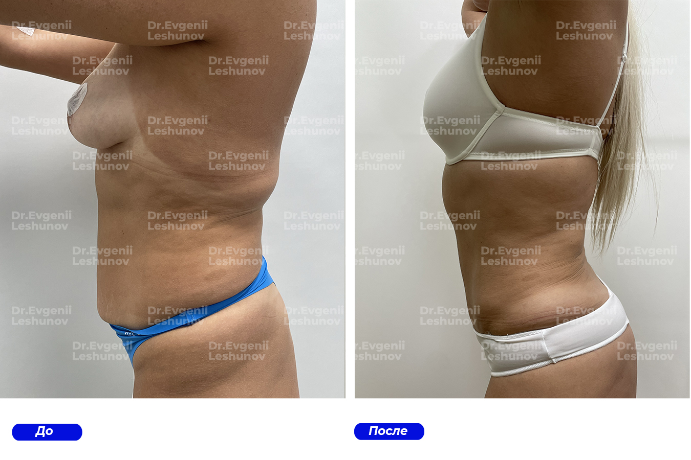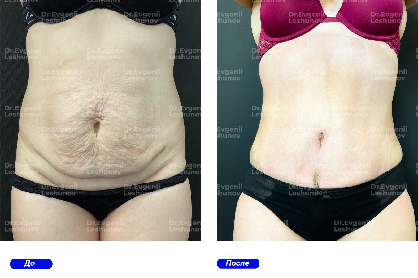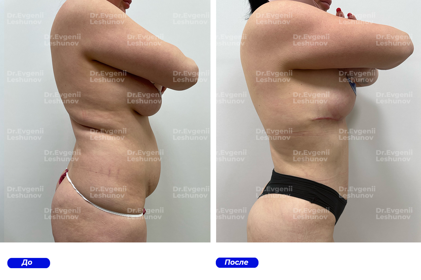 Пациентка, 46 лет, обратилась с жалобами на избыток жировой клетчатки в области живота, фланков и поясницы, нависающий кожно-жировой лоскут над имеющимся после кесаревого сечения рубцом, диастаз прямых мышц живота и пупочную грыжу. Была выполнена липосакция передней брюшной стенки, фланков и поясницы, выполнено иссечение кожно-жирового лоскута в пределах имеющегося рубца, перемещение пупка, устранение диастаза прямых мышц живота и пупочной грыжи. Результат через 1 месяц после операции.