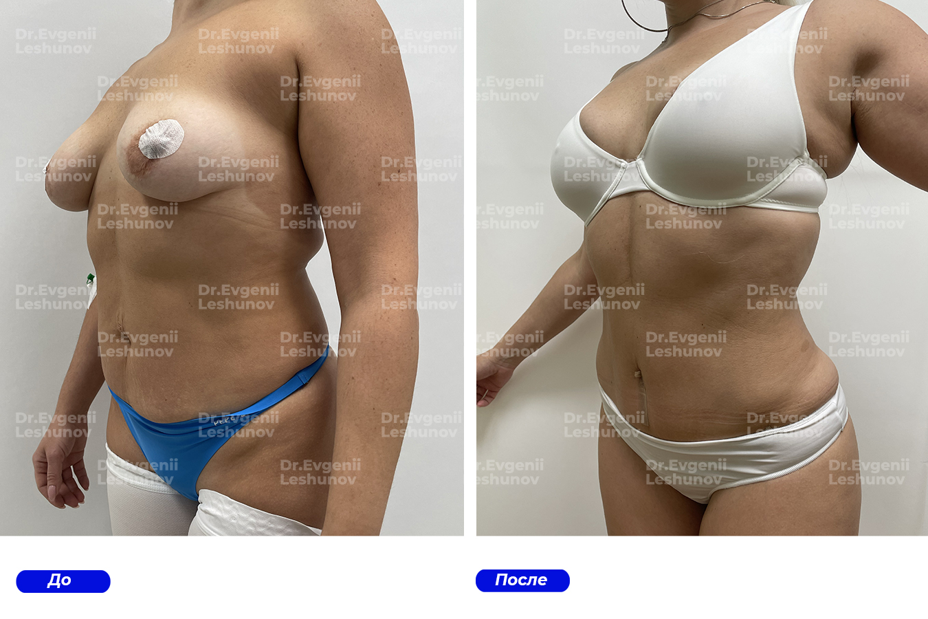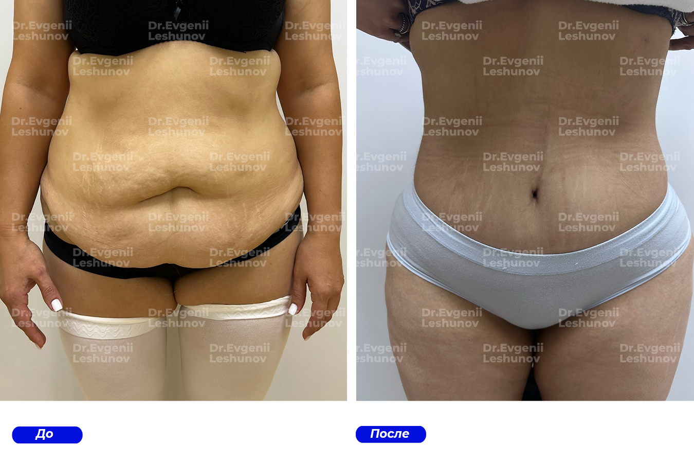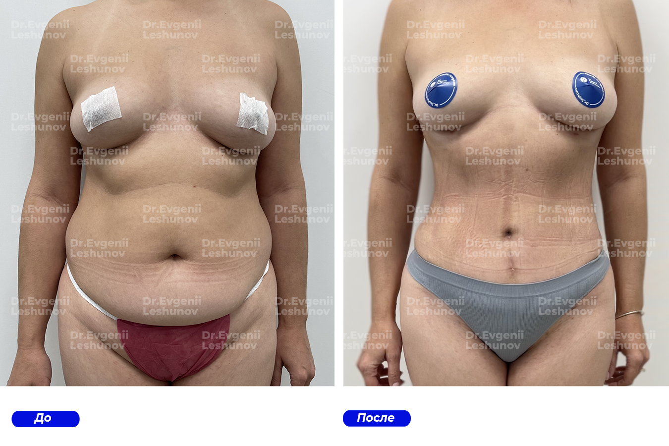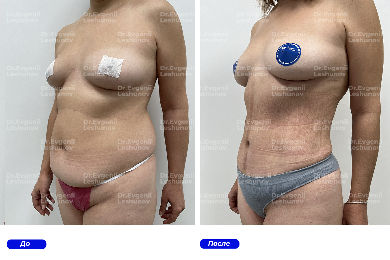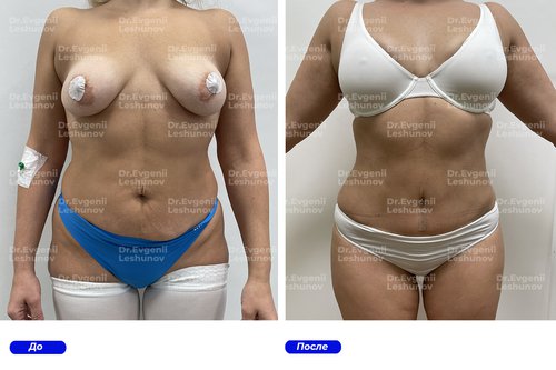 Пациентка, 46 лет, обратилась с жалобами на избыток жировой клетчатки в области живота, фланков и поясницы, нависающий кожно-жировой лоскут над имеющимся после кесаревого сечения рубцом, диастаз прямых мышц живота и пупочную грыжу. Была выполнена липосакция передней брюшной стенки, фланков и поясницы, выполнено иссечение кожно-жирового лоскута в пределах имеющегося рубца, перемещение пупка, устранение диастаза прямых мышц живота и пупочной грыжи. Результат через 1 месяц после операции.
