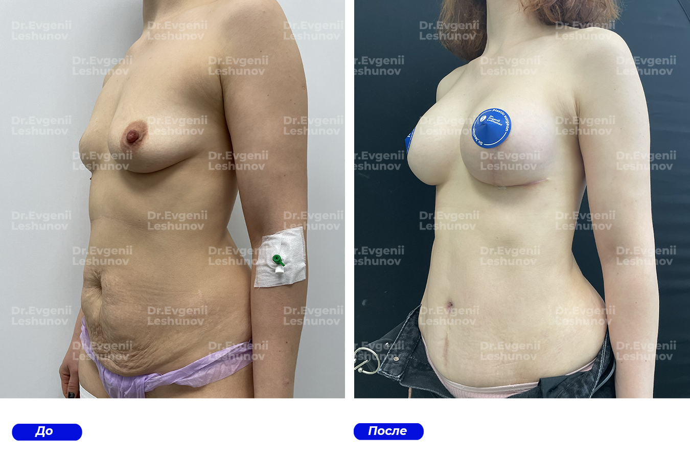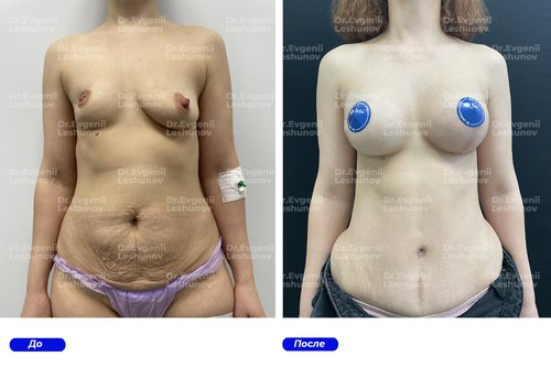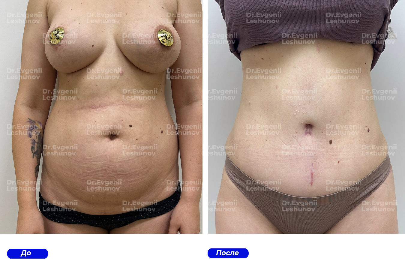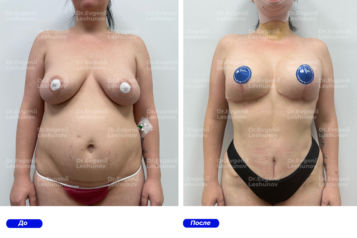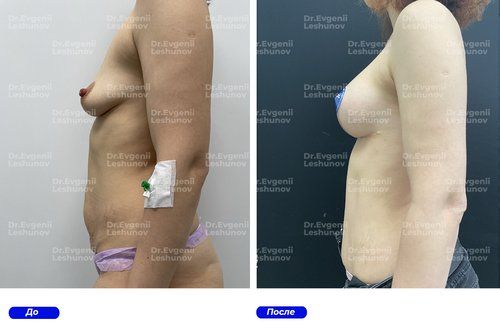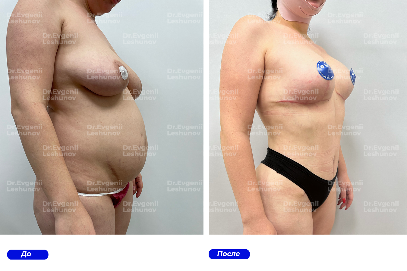 Пациентка, 46 лет, обратилась с жалобами на избыток жировой клетчатки в области живота, фланков и поясницы, нависающий кожно-жировой лоскут над имеющимся после кесаревого сечения рубцом, диастаз прямых мышц живота и пупочную грыжу. Была выполнена липосакция передней брюшной стенки, фланков и поясницы, выполнено иссечение кожно-жирового лоскута в пределах имеющегося рубца, перемещение пупка, устранение диастаза прямых мышц живота и пупочной грыжи. Результат через 1 месяц после операции.